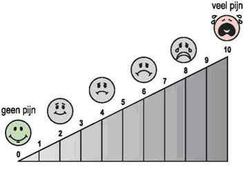 Dit gaat door middel van het vragen om een cijfer te geven aan de ernst van de pijn. Het cijfer ligt tussen de 0 en de 10. 0 is geen pijn en 10 is de ergst denkbare pijn.
